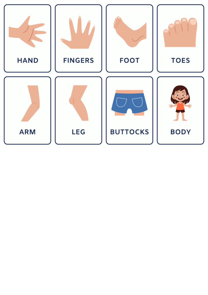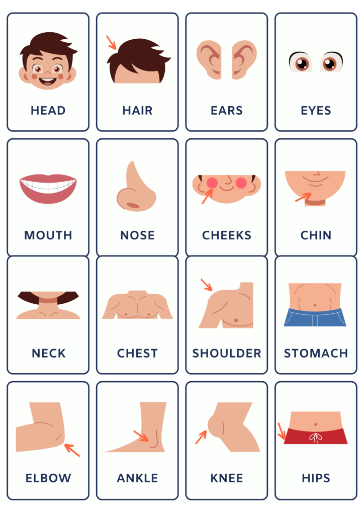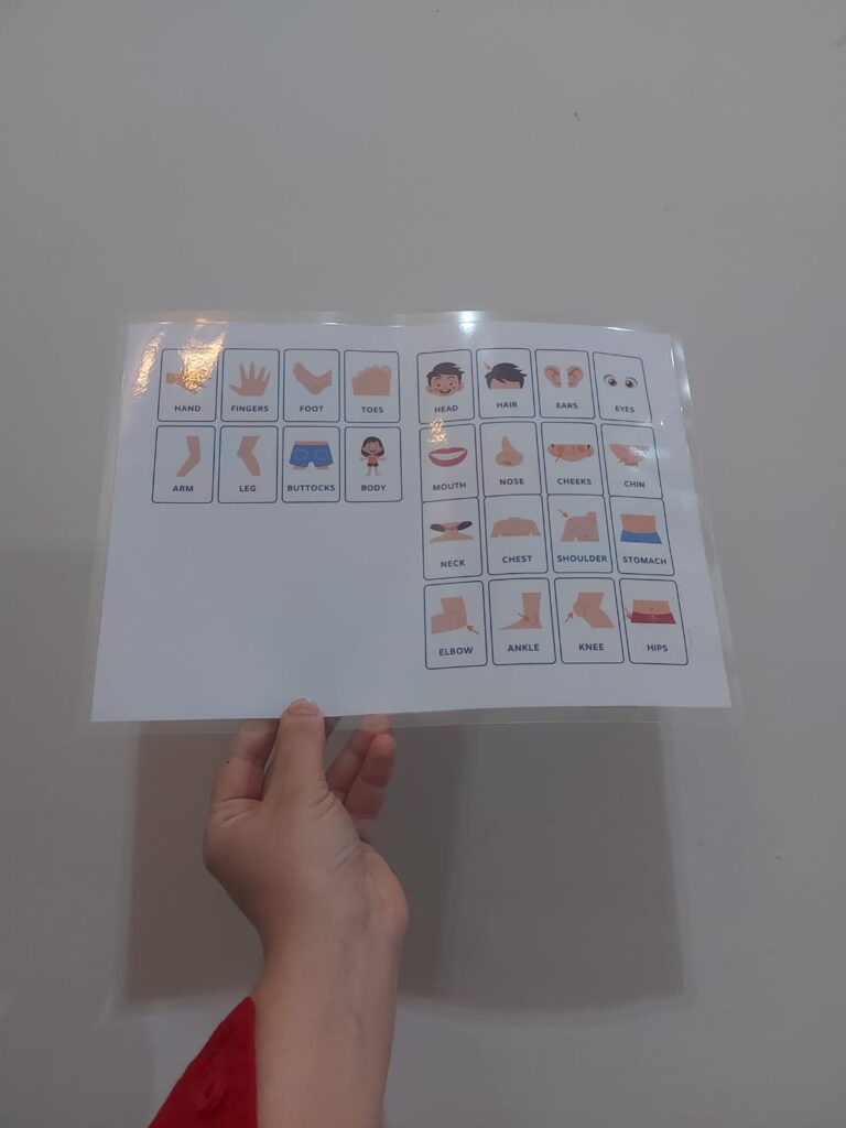 Now comes the fun part – ask your little one to place each body part where it belongs on the empty figure. As they work, name each part together: “Where do the eyes go? Yes, on the face! Can you find the nose?”